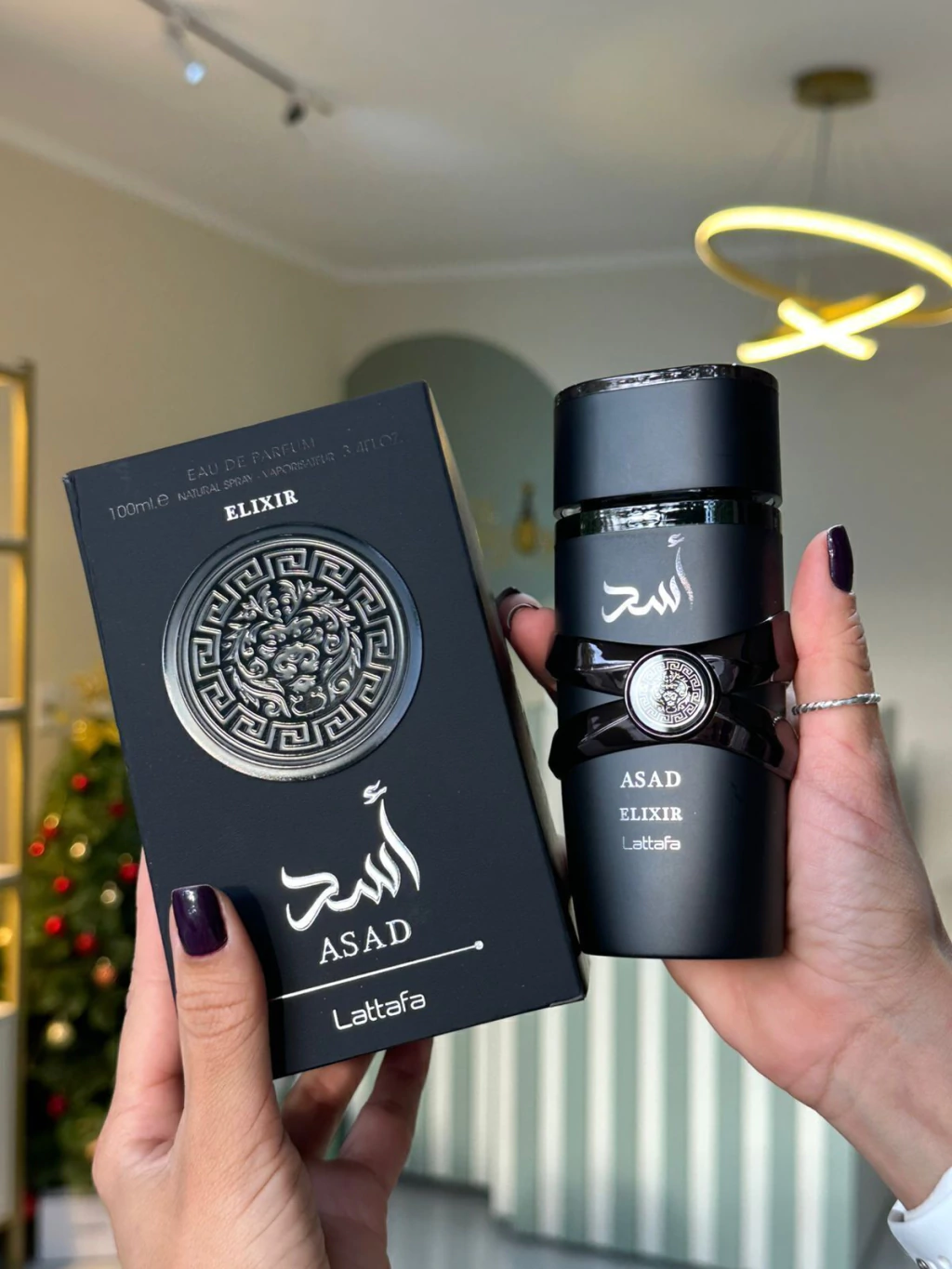 Asad Elixir de Lattafa Perfumes é um perfume Oriental Masculino. Esta é uma nova fragrância. Asad Elixir foi lançada em 2025. As notas de topo são: Toranja, Pimenta Rosa e Açafrão. As notas de coração são: Tabaco, Cedro e Baunilha. As notas de fundo são: Âmbar Claro, Patchouli, Olíbano e Cashmeran.