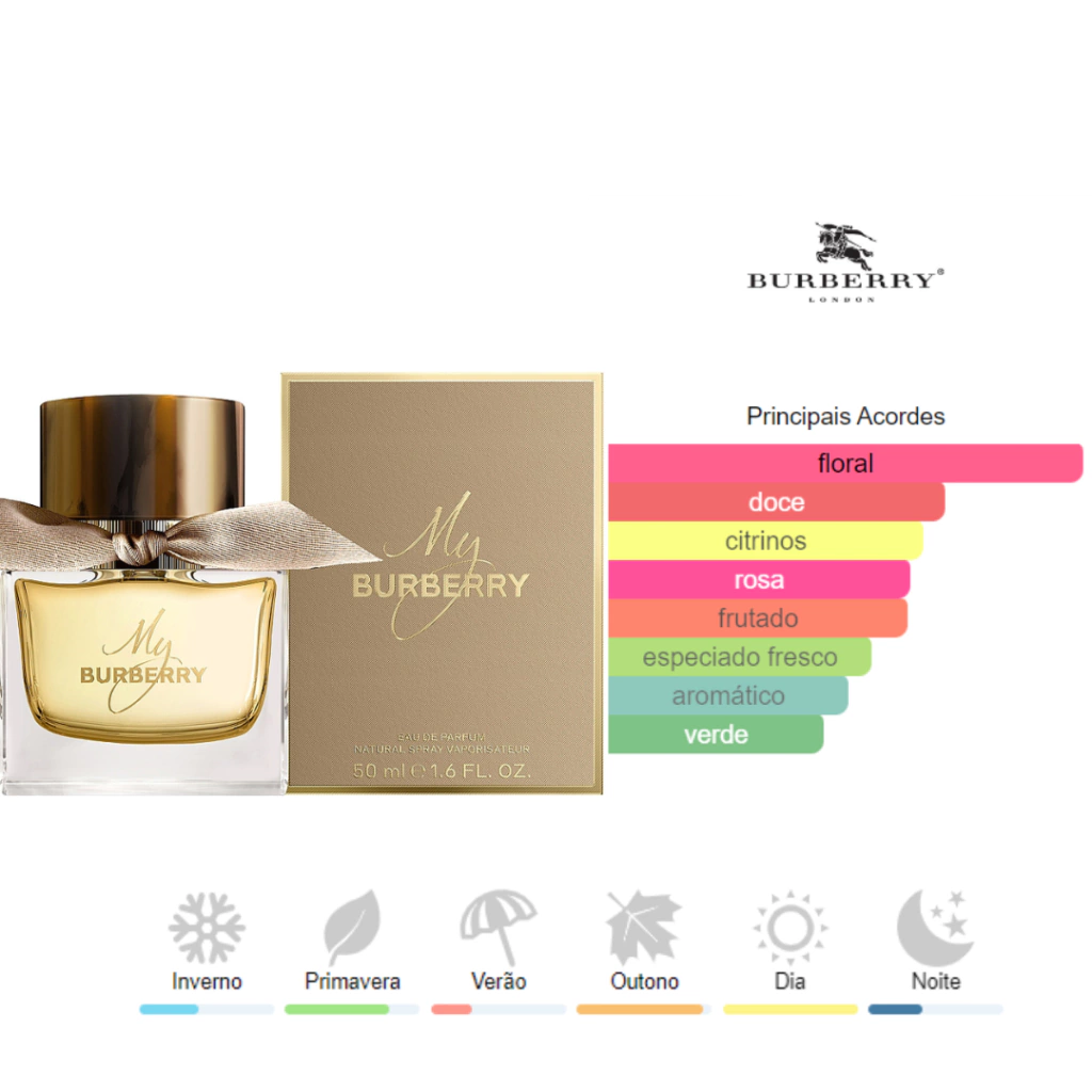 My Burberry de Burberry é um perfume Floral Feminino. My Burberry foi lançada em 2014. O perfumista que assina esta fragrância é Francis Kurkdjian. As notas de topo são: Ervilha de Cheiro, Bergamota, Mandarina, Toranja e Limão. As notas de coração são: Marmelo, Frésia, Gerânio, Pêssego, Notas Verdes, Gardênia e Maracujá. As notas de fundo são: Rosa Damascena, Rosa, Patchouli, Almíscar, Couro e Violeta.