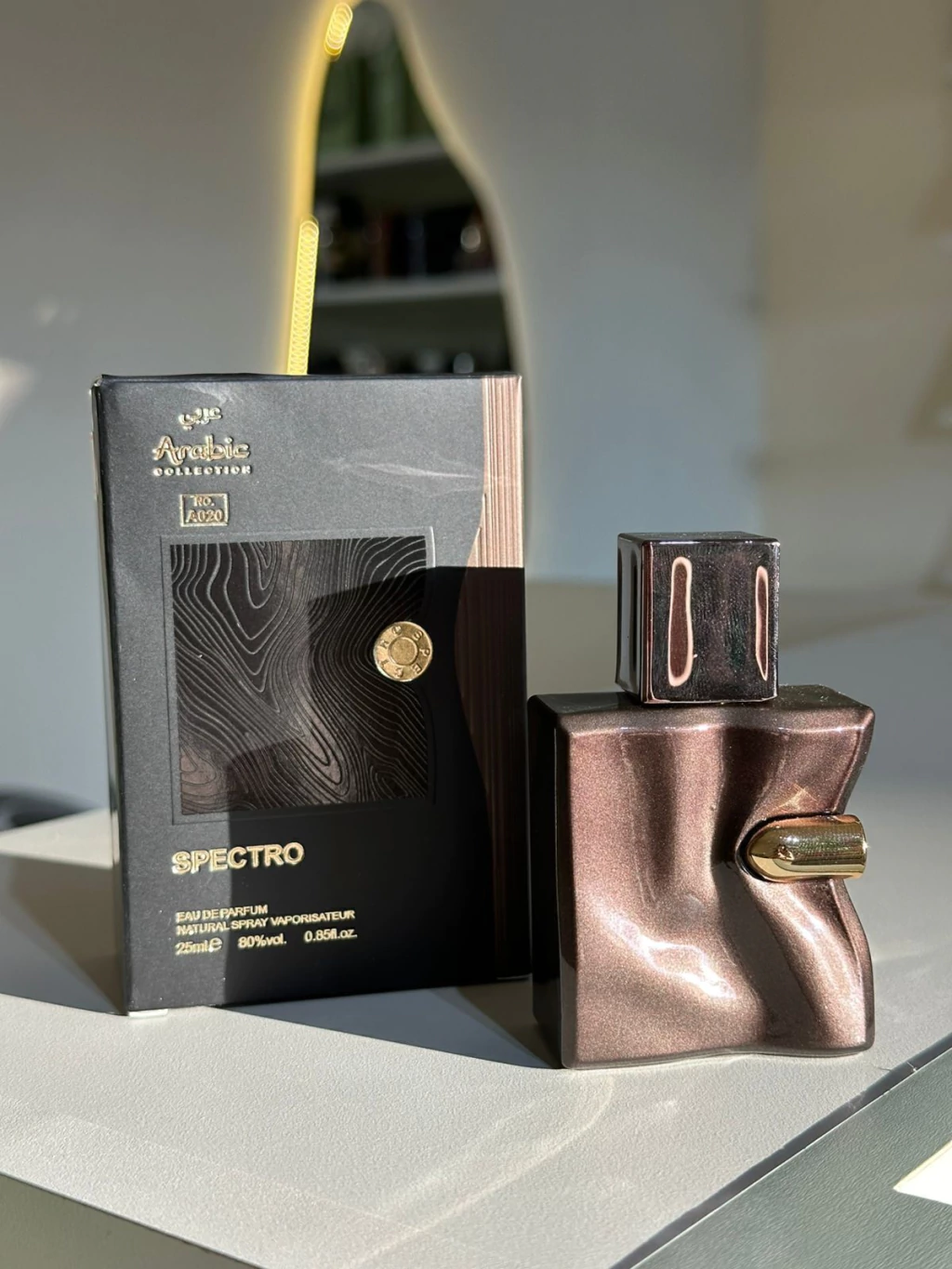 O frasco do Perfume Arabic Spectro A020 - Masculino 25ml reflete a essência moderna e intrigante do perfume, com um design minimalista e detalhes que evocam mistério e elegância. Uma embalagem que combina perfeitamente com a personalidade da fragrância.