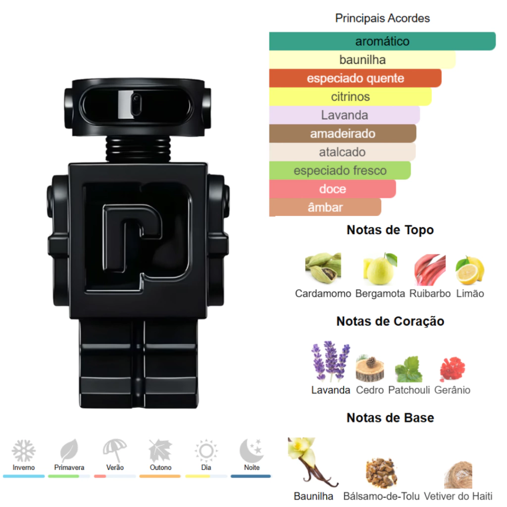 é um perfume Aromático Masculino. Esta é uma nova fragrância. Phantom Parfum foi lançada em 2023. Phantom Parfum foi criado por Juliette Karagueuzoglou, Dominique Ropion e Anne Flipo. As notas de topo são: Cardamomo, Bergamota, Ruibarbo e Limão. As notas de coração são: Lavanda, Cedro, Patchouli e Gerânio. As notas de fundo são: Baunilha, Bálsamo-de-Tolu e Vetiver do Haiti.